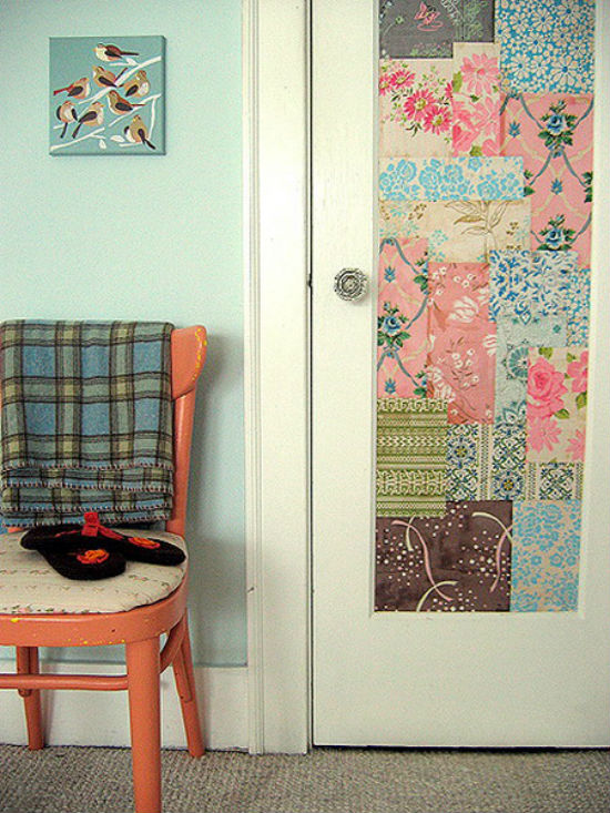 9. Thay vì một chiếc cửa kính cứng nhắc, bạn có thể dán giấy dán tường thừa lên mặt bìa cứng và xếp gọn gàng lên của kính. Vừa có thể thay thế chiếc rèm ngăn cách giữa hành lang và căn phòng, lại vừa phá cách tạo điểm nhấn.
