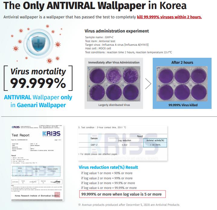 Các kết quả thử nghiệm cực kỳ nghiêm ngặt tại Hàn Quốc đã chứng minh được công nghệ này của hãng GNI hiệu quả. Theo như được biết, đây là hãng sản xuất giấy dán tường đầu tiên tại Hàn Quốc đạt được chứng nhận này.